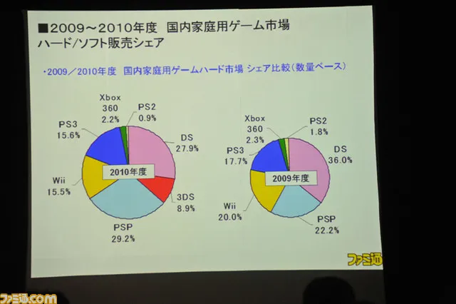 Also an interesting info bit revealed in this slideshow was the estimated market share of each console. This graph below shows the Wii, PSP, and PS3 getting bumps up from 2009 to 2010, while the PS2, DS, and Xbox 360 lost some ground.