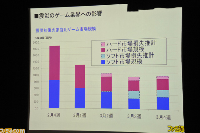 This past weekend, at a seminar in Tokyo, Enterbrain CEO Hirokazu Hamamura delivered some details and company estimates. The first piece of data he spoke on was the headliner, as this conference was subtitled “How Much Did the Disaster Affect the Game Industry?” In the following image, the colored bars are gauges of weekly sales, the leftmost one being the last week of February, the next ones being weeks of March. The dark blue represents software sales while the light purple atop it shows hardware sales. In the second week of March, the light blue shows up, which represents Hamamura’s estimated software sales losses. Pink likewise stands for estimated loss of hardware sales.