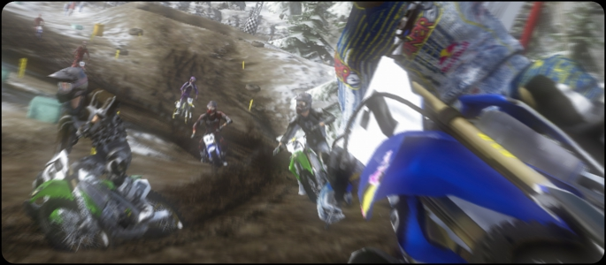 The physics engine in MX vs. ATV Alive has a nice real-time terrain deformation element to it, which was originally introduced in the previous entry in the series, Reflex. After a number of laps, eventually the dirt contains grooves which can actually aid you in making a turn cleanly if you entered it too quickly. However, this does result in the occasional odd reaction, which can and will throw your rider into a very bizarre angle on a banked turn or jump. This usually results in a huge loss of momentum or even a crash. It seems to happen fairly regularly, though eventually you can learn to predict where this is more likely to happen on a given course.