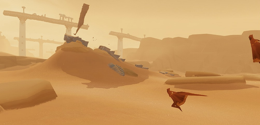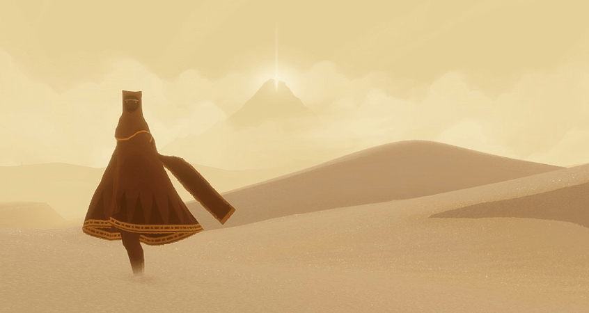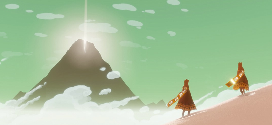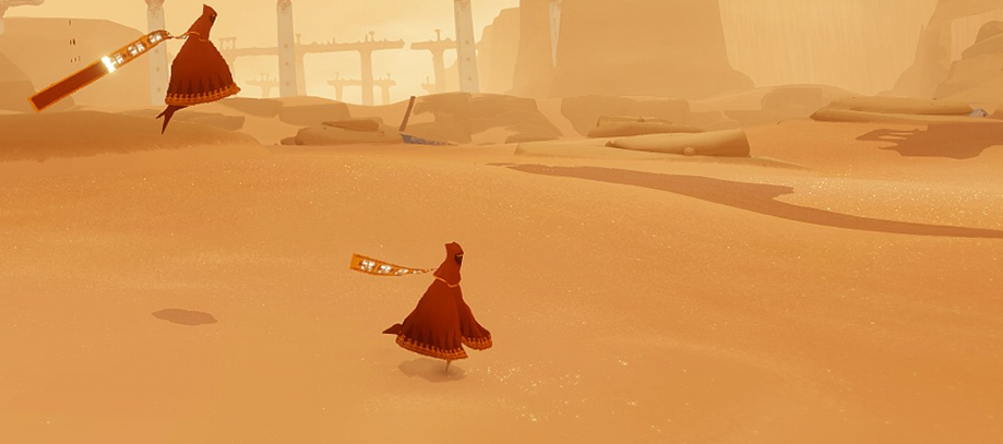 Journey gives no instructions to the player, they are tossed into the middle of a vast desert with only a strange mountain in the distance. The goal of the game is to reach the mountain. Along the way, you can run into other players who are trying to reach the mountain, as well. You will only be able to see one other player at a time. Voice and text chat will not be supported and players will not be identified with gamertags, so the only way two people can communicate is with a shout. Much like Demon’s Souls, the emphasis is that two strangers are helping each other out in a vast world. As game director, Jenova Chen, has described it, “It’s about two strangers who meet online. They don’t know who they are or how old they are. All they know is, that is another human being.”