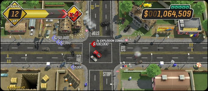 It’s clearly crash mode, and yet seems like such a step back from the crash modes we know and love. Still, we can clearly see a number of the fun mechanics are implemented, such as multiple explosions to keep chaining up hits, and special vehicles to try to knock off the road in the process. It’s also quite obvious a new feature involving environmental destructibility has been implemented, with building blowing up after taking enough damage, as well as trees and other structures. Richard Franke, Creative Director for Burnout CRASH! commented on the game, stating: