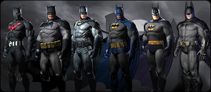There are five different Batman suits available for gamers that pre-order Arkham City, but there is also one suit available for Robin to use in the challenge rooms. The suits are pictured above, and from left to right they are: Batman Beyond, the Dark Knight Returns, Earth One Batman, 1970’s Batman, the Animated Series Batman, and the original Batman Arkham City skin for comparison. Below is a list of where gamers can find each Batman suit. Notice that ordering from Mighty Ape will get you the Earth one, Batman Beyond, and the Animated Series skin.