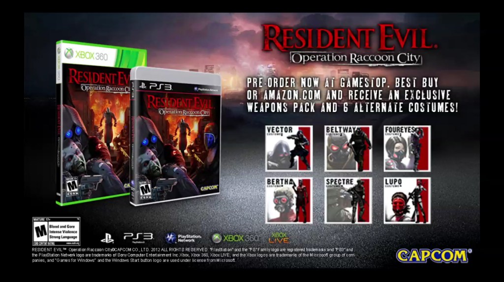 At the end of the trailer, Capcom reveals that pre-ordering at Amazon.com, GameStop, or Best Buy will receive an exclusive weapons pack and six alternate costumes. The costumes are named: Vector, Beltway, Foureyes, Bertha, Spectre, and Lupo. To see more details, click on the last image at the end of the gallery.