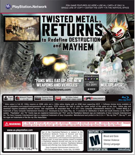 David Jaffe, the creative force behind the Twisted Metal franchise, has released an HD version of the game’s tentative cover art. The artwork originally appeared on GameStop’s website earlier in the week. He also posted five different variants of the game’s back cover art.