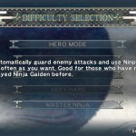 The screenshots show the game’s difficulty levels (Hero Mode, Normal, Hard, Very Hard, and Master Ninja). Hero mode is for newcomers and features automatic guard, evasion assists, and simple controls for enhanced Ninpo techniques. The screenshots also show Ninpo or some kind of attacks/magic being accessed via the rear touch panel, Ryu attacking three enemies with a staff, Ryu attacking using an ice spell, the main menu screen and a mission select screen as well. The main menu screenshot shows Ninja Trials, a series of challenges for NGS Plus gamers, of which there are 76.