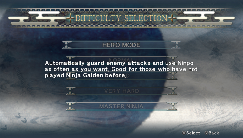 The screenshots show the game’s difficulty levels (Hero Mode, Normal, Hard, Very Hard, and Master Ninja). Hero mode is for newcomers and features automatic guard, evasion assists, and simple controls for enhanced Ninpo techniques. The screenshots also show Ninpo or some kind of attacks/magic being accessed via the rear touch panel, Ryu attacking three enemies with a staff, Ryu attacking using an ice spell, the main menu screen and a mission select screen as well. The main menu screenshot shows Ninja Trials, a series of challenges for NGS Plus gamers, of which there are 76.