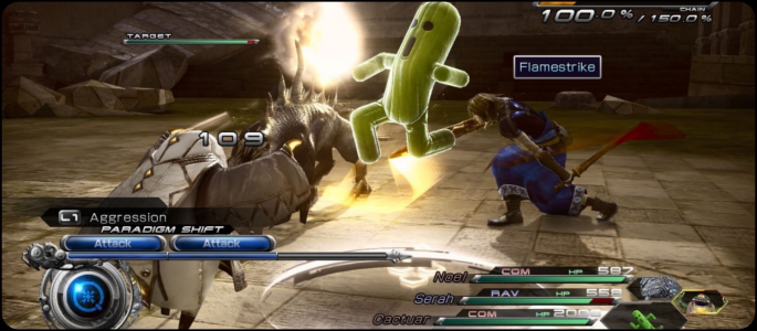 For the most part, battles have remained the same as they were in FFXIII, the biggest change being summons swapped out for group attacks. The same combatant roles are there, and players can once again group them as they please to fit their play style. Changing strategies for certain boss fights is a necessity, and drawing up the battle plans now has an extra twist. The third party member is a captured monster. Any monster that the team captures (this is done automatically, by chance, after winning a battle) can become an ally and has one specific role. Players select three different monsters to have on board for battles and then configure their Paradigms. This is where the game can get really addictive for level-up fiends, as monsters make progress through use of items, the vast majority of which can only be found after battles. Wanna get that next little smidge of statistical progress for your monster buddy? That’ll be two items. Another level will be two more. It’s strangely engaging to be constantly checking on the monster’s stats and wondering if another beast in the group could potentially prove more useful than one of the three in your main group, improving your little dudes a small step every handful of battles. Final Fantasy XIII did have some super cute enemies as well as a few badasses, so having them along for the ride, while probably sounding awful to some people, is surprisingly fun.