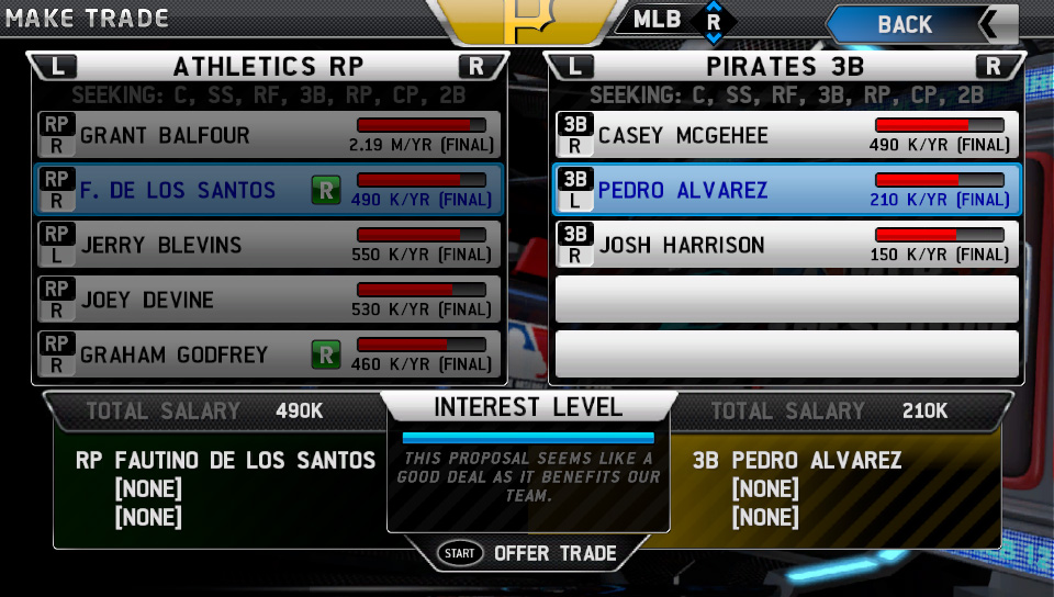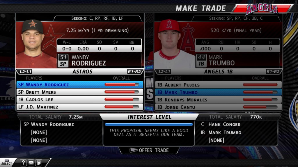 Aaron Luke, the designer for MLB 12 The Show, reveals that the team wanted to improve trade logic for CPU teams, which they’ve done by including more trade factors. Teams are going to value their rosters much higher, they’re aren’t going to ship out prospects easily, and they won’t offer up too many players to fill a positional void. Trade logic will also reflect mentalities such as aspiring for playoff runs or rebuilding rosters. The trade screen itself has been revamped with many more details about each player.