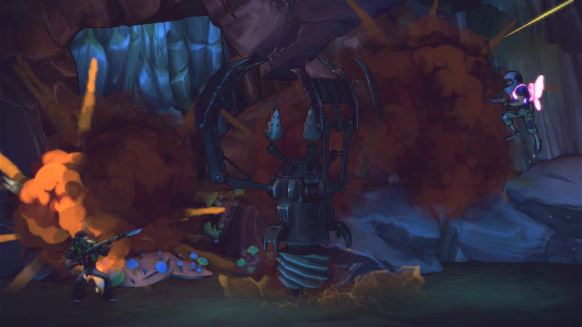 For those not familiar with the game, SMR is a side-scrolling four-player run-and-gun co-op shooter with tons of weapon and item customization. The game has two modes: Traversal (progress through levels) and Survival (fight waves of robots). The game’s main character is P. Walter Tugnut, who decides to kill as many robots as possible after a factory begins producing killer robots.