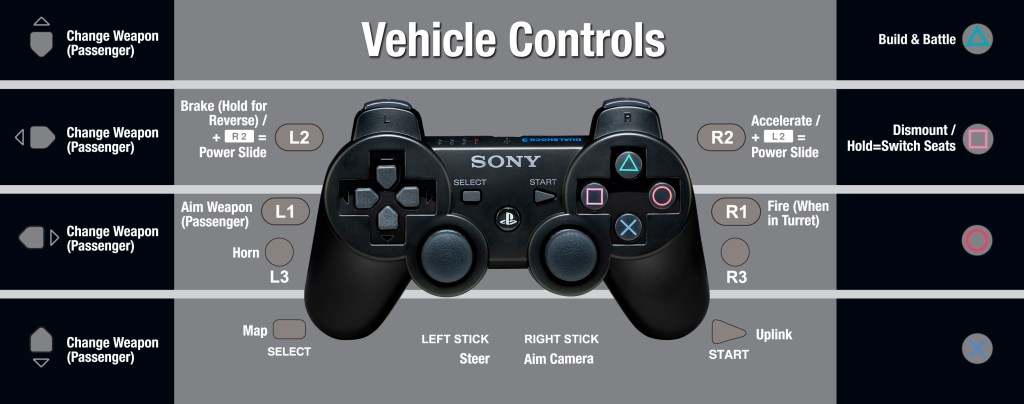 Sony released images of the control layouts for characters, vehicles, and aircraft, in addition to map layouts for the Scourge and Space maps. To view those, click on the Media Gallery below: