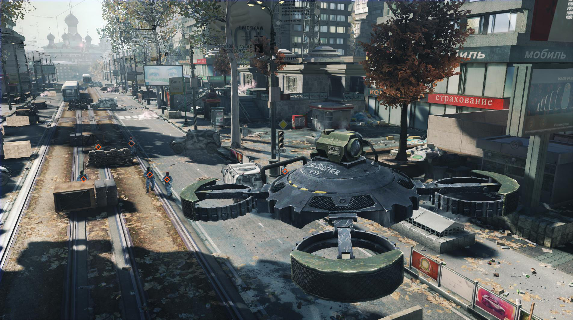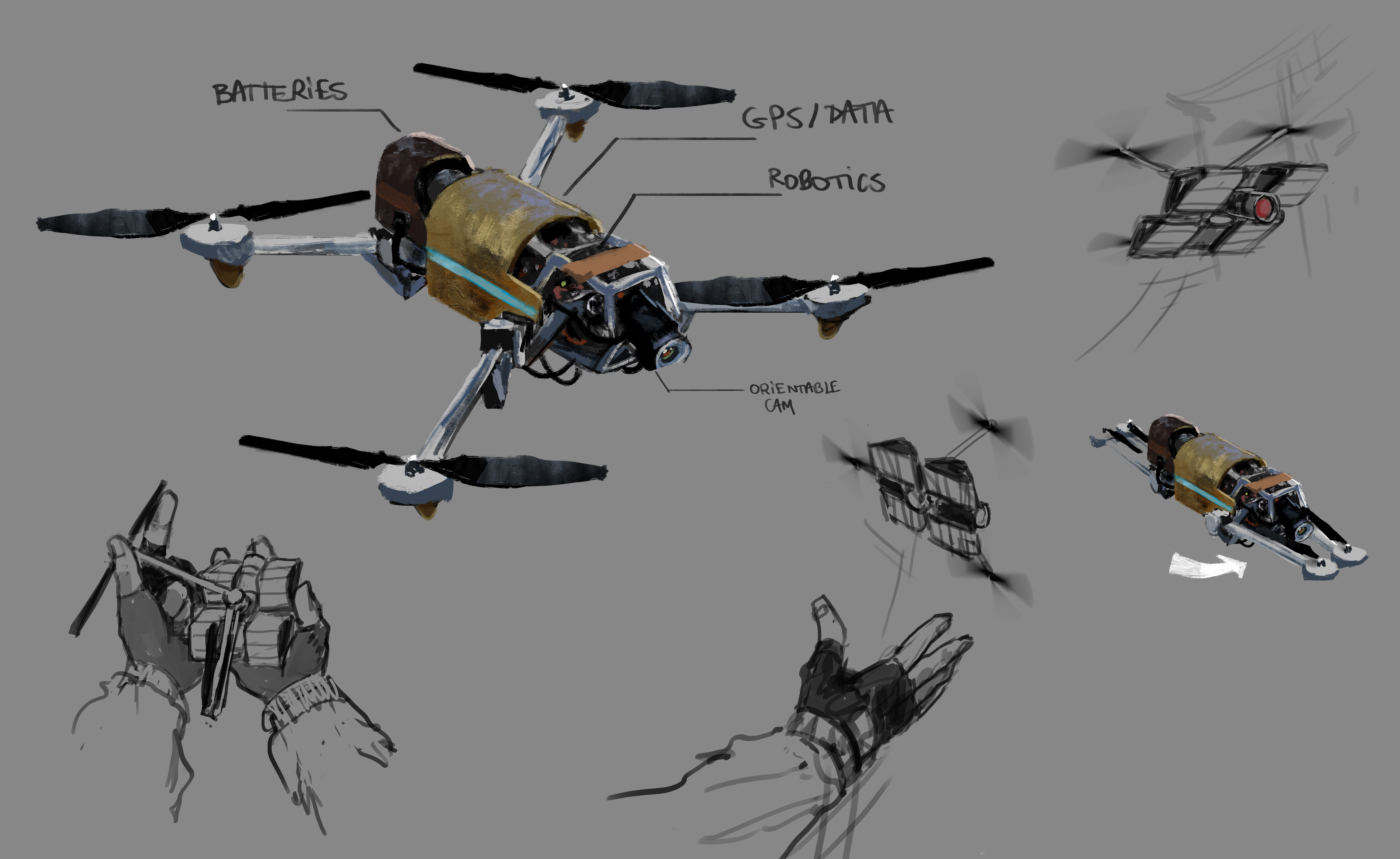 Ubisoft also released screenshots of the game and some concept art. Most of the screenshots show the drone in various activities: using the camera to identify targets, flying above targets which have been marked, and flying next to a Ghost. One shows a Ghost with what appears to be a Thrown Sensor above his head. (The Thrown Sensor identifies hostiles and indicates their positions on the HUD. Its signal can penetrate walls, vehicles, and other objects.) One shows a close-up of a Ghost’s head with his Cross Com on in his glasses. One shows a Warhound (a self-mobile, unmanned vehicle which delivers artillery and also acts as cover for the Ghosts). The concept art is of the drone and the Warhound.