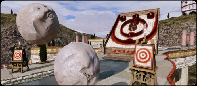 Rock of Ages also features a Time Trial mode where you race from the start of a level to the end attempting to get the fastest time possible. There’s also a Skeeball Training mode where the end of the level has a skeeball target setup. Knocking down structures nets you points, and getting the boulder into specific holes on the skeeball ramp provide different multipliers. In single player this is offered as a training mode for the multiplayer suite. New to the PSN version there’s also an Obstacle Course mode where the player goes head-to-head in a best of three series of races against an AI opponent. However, there are also obstacles that get progressively worse which will slow down you and your opponent in successive rounds. There are also power-ups to pick up along the way to help you get an edge through some of the trickier defenses.