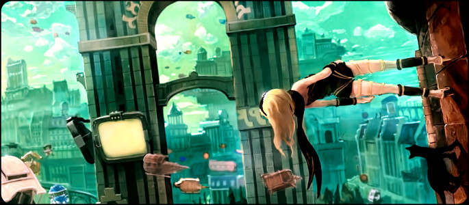 Story is certainly not the reason one plays a game like Gravity Rush, but what’s there is surprisingly interesting. With gameplay this good, this unique, and with this much innovation, Sony could have easily gotten away with phoning this aspect in—”Oh whoa I got these crazy powers by being hit by a shooting star and bitten by a radioactive moon man, now I have to save the world from moon men!” We see that happen in all kinds of games with regularity, and frankly, that’s fine in most cases; yet the story in Gravity Rush actually manages to do a bit more than one might expect…while still of course including a few helpings of moon men. It’s not going to win award for its tale, but it does the base job of an action/adventure/platform game story in providing the character with a reason for doing what she’s doing, then keeping things fresh and somewhat engaging for the game’s duration. This rabbit hole goes deeper than what would generally be expected of this type of game, for the better.