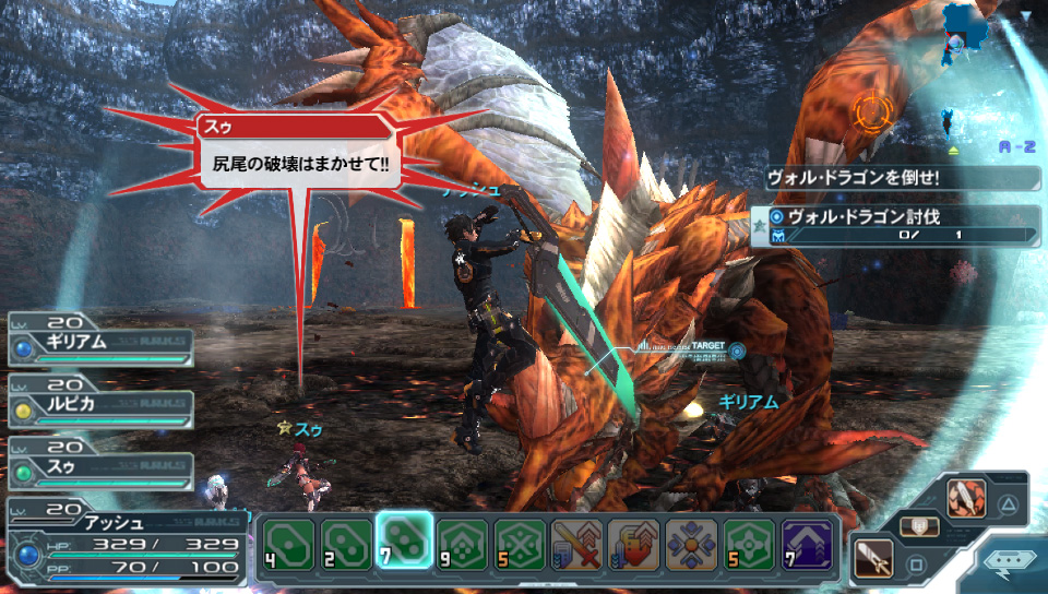 After taking out several small-to-mid sized monsters, it was on to fight a big dragon. This is a central theme in handheld RPGs right now: groups of two or more go fight huge enemies in a grand, action-RPG format. It’s working for Gods Eater, Monster Hunter, Soul Sacrifice, and Phantasy Star Online 2. We began the demo actually pretending to care about our health, but once that dragon showed up, we focused purely on offense to take him down within the demo’s time limit. Everyone at the table understood that it otherwise would have been a very intense and difficult affair.