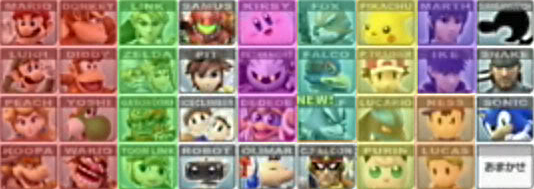 The image above is visually coded to properly convey the general lack of diversity, of the Smash Brothers cast; each color denotes a single franchise (PlayStation All-Stars in contrast is sticking to one main character per franchise, rather than using sidekick/support characters)