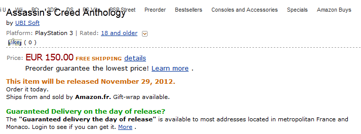 It looks as though Ubisoft won’t rest with just releasing Assassin’s Creed: Ezio’s Trilogy in the month of November as Amazon France has posted a listing for Assassin’s Creed Anthology.