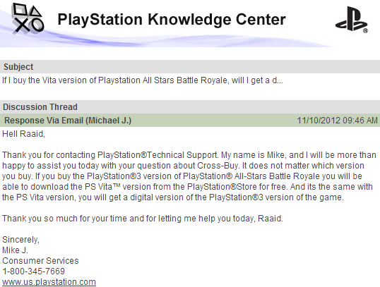 A user on the PlayStation All-Stars community forums, has shared an image of a Sony Customer Service reps reply to his inquiry about whether buying the Vita version of PlayStation All-Stars entitles you to the PS3-powered HD version of All-Stars. The representative had a very interesting reply: