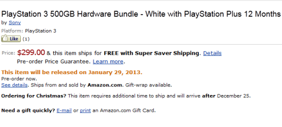 A listing by Amazon.com reveals the ‘PlayStation 3 500GB Hardware Bundle – White with PlayStation Plus 12 Months’, currently scheduled for release on January 29th, 2013. It also carries a price of $299, the exact same as the Assassin’s Creed III 500GB PS3 Bundle.