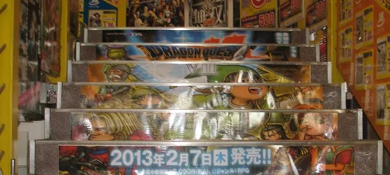 Really, if you have to pick one thing that is the biggest of the big in Japanese gaming in February of 2013, it’s the 3DS remake of Dragon Quest VII. Now I know, I know, a lot of you will raise an eyebrow and be like “Whaaat? No way, I want Metal Gear Rising way more!” but see, I’m talking about what’s going to sell, what’s going to be talked about by half the people you know, and what’s going to be unavoidable as far as Japanese existence goes. These, for example, are the steps to the second floor of one game shop in town: