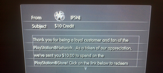 If you’ve checked your PSN messages within the last few hours, some of you may have noticed that there is something from Sony about a $10 PSN credit. Inside, the message thanks you for being a “loyal customer and fan of the PlayStation Network” and they are giving you $10 to spend on the PlayStation Store.
