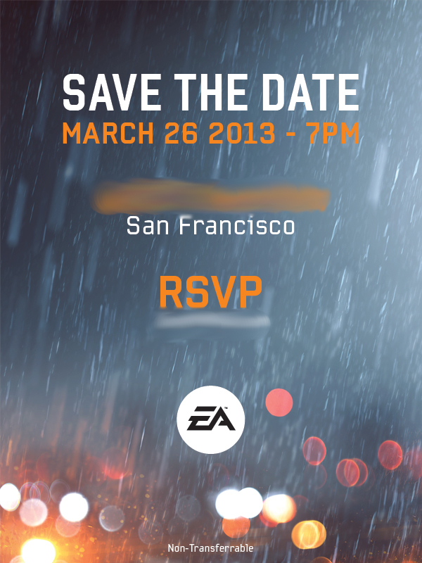 The invite, which was also reported on by IGN and is shown above, features the prominent background art and color palette that has become synonymous with the Battlefield franchise, and states that the press event will take place in a movie theater. Given the recent announcement of the PS4, it seems highly likely that this will be an event for EA to officially announce the game, especially because they said they would reveal some games before E3.