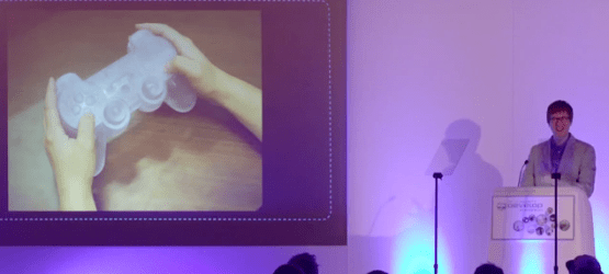 He then talked about how their testing showed that “8 year olds have difficulty of the controls schemes of many games,” due to the size of the controller, compared to the size of their hands. Because of this, they made a 50% larger controller to understand how it felt like being a child playing a game, realizing that “the shoulder buttons are simply out of reach for the typical 8 year old, but that all the face buttons could be used quite readily.”