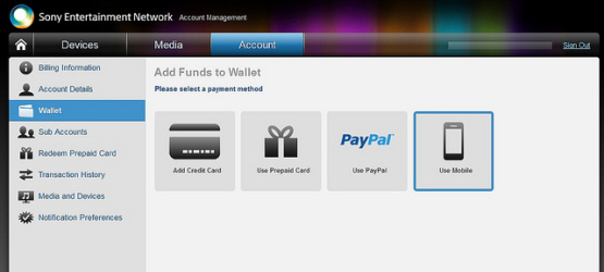- Through the PlayStation Store on PS3, or the Account Management section of the Online Sony Entertainment Network website, you can go to the Add Funds to Wallet section and now choose Use Mobile as an option. If you do this, you need to enter your phone number and then respond via SMS to confirm the added funds, with the charge appearing on your next phone bill or pre-paid account. [Source]