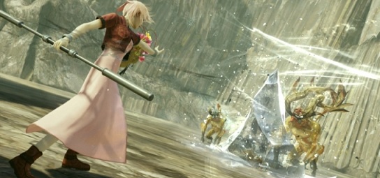 Battles reminded me not only of previous FFXIII games, but also of a single-character version of Final Fantasy X-2. Switching jobs in mid fight was quick and easy — just the touch of a button — and come with full costume changes like they did in X-2. Each job has its own ATB, meaning quick players can really lay a barrage on the enemy. There’s ample incentive to constantly be on the switch, as well, because using one job replenishes the power of your other jobs. Are the bad guys winding up for a big attack? Quick, switch to something with good defense! Things like that make fights a good combination of strategy and finger skill. From the looks of the menu’s guts, you can highly customize your jobs, as well.