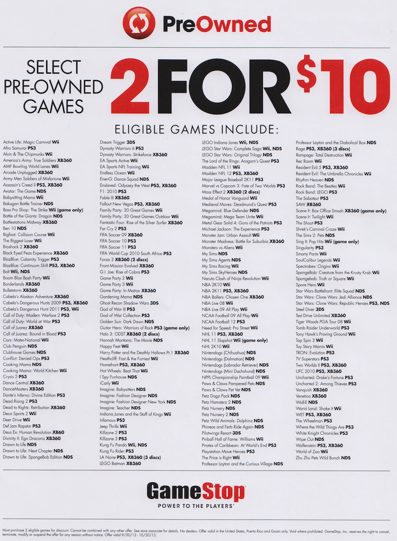 Starting today, GameStop USA has begun a 2 for $10 sale on select used games (in-store only), with the full range of titles shown in this list (via CAG):