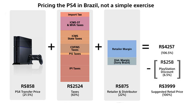 There is a lot of confusion and inaccurate information spreading online about Brazil’s import tax policies online and the PlayStation 4 retail price, so we’d like to set the record straight: of the R$3,999 gamers pay, 63% of the retail price goes to offset the various taxes that are applied in the process of importation. Some do not consider the IPI on the distributor price and PIS/COFINS on retailers price and much less, include the ICMS and ICMS-ST taxes. You can see a true breakdown of the price model at Valor Economico. The other 15.5% goes to retailer margin and 21.5% to PS4 Transfer Price (equivalent to USD$390).