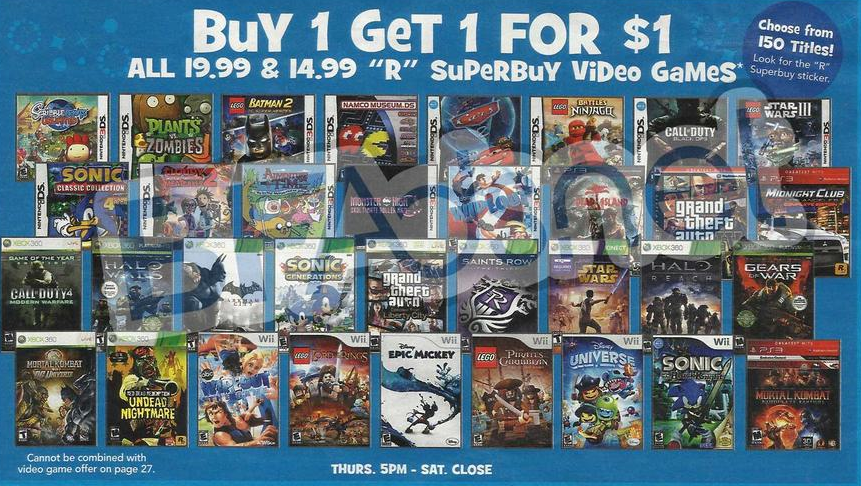 - Buy 1, get 1 for $1 on all $19.99 and $14.99 SuperBuy Video Games (150 to choose from, 28th – 30th)