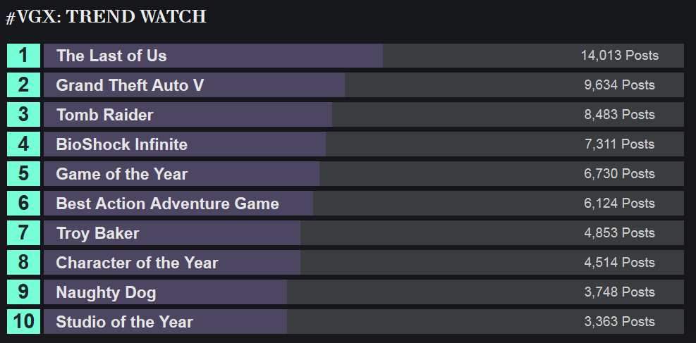 - The Last of Us may have lost Game of the Year honors to Grand Theft Auto V, but it did win when it comes to trending content during VGX [Source]: