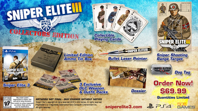 505 Games announced today that Sniper Elite 3 will be released on June 27th in Europe and July 1st in North America for the PlayStation 4, PlayStation 3, Xbox One, Xbox 360, and PC. It will cost $49.99 on PS4 and $39.99 on PS3, with a Collector’s Edition for the PS4 running $69.99, as detailed by GameStop: