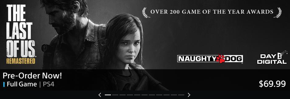 The banner that appeared on the PlayStation Store doesn’t actually link to anything, but what we can tell from the ad is that it will be called The Last of Us: Remastered, cost $59.99 in the United States and $69.99 in Canada, it will be available for pre-order before launch, and will launch on the PlayStation Store at the exact same time as retail.