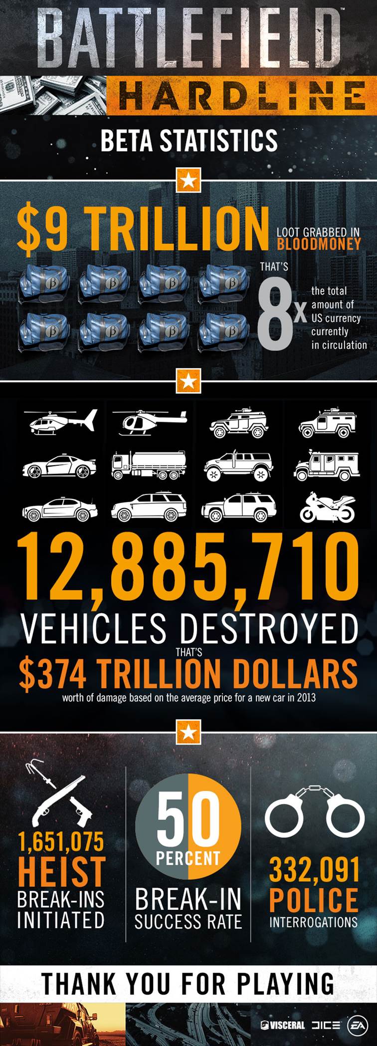 EA has released an infograph of what players accrued during the Battlefield: Hardline beta. For starters, $9 trillion in in-game money has been grabbed by players, which is 8x the total amount of US currency currently in circulation.