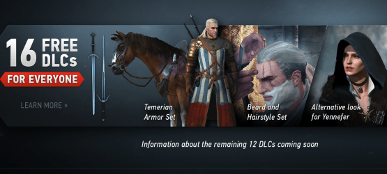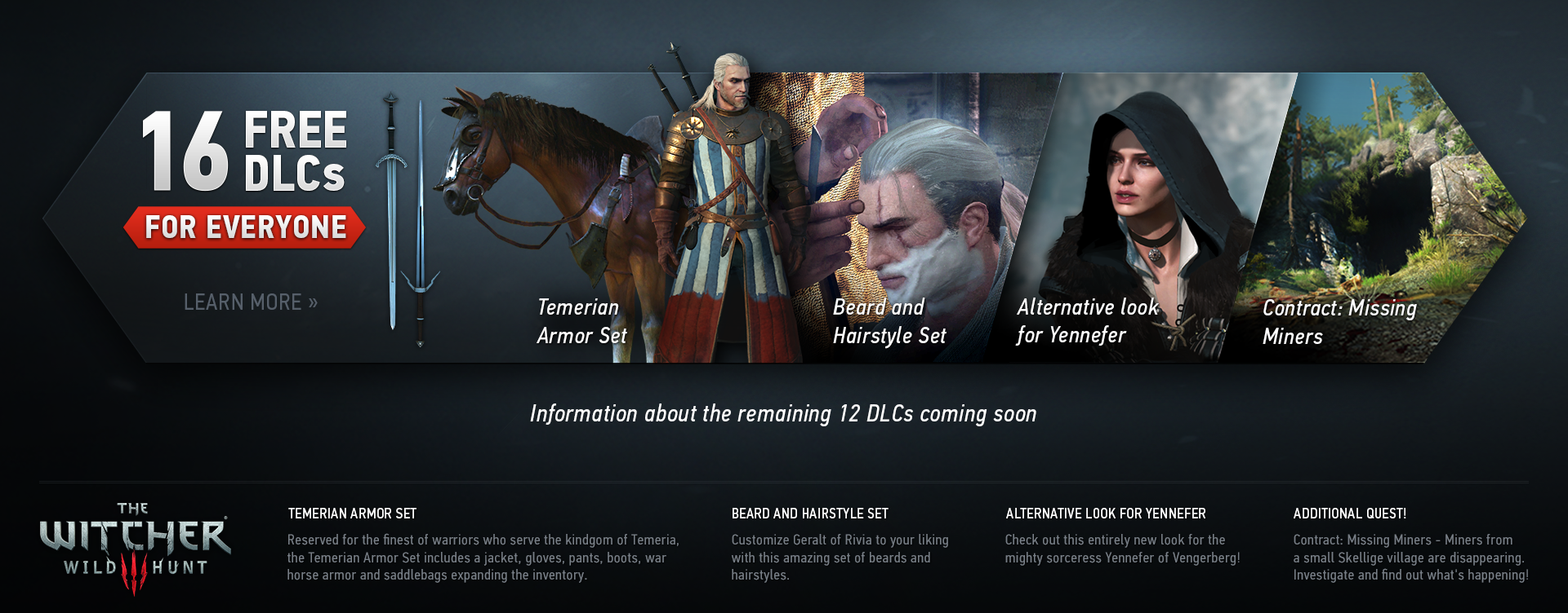 With The Witcher 3: Wild Hunt launching on February 24, 2015 for the PlayStation 4, Xbox One, and PC, the first two pieces of DLC will be released on February 25, which include the Temerian Armor Set (horse armor included) and a Beard and Hairstyle Set for Geralt, the game’s protagonist. Following this, two pieces of DLC will be given away every week for free until all 16 are available. Full instructions on how to obtain the DLC will be given at a later date.