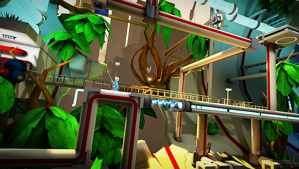 You manoeuvre around the world by using the significant recoil from your gun to achieve large jumps while being aided by your robot Kick.