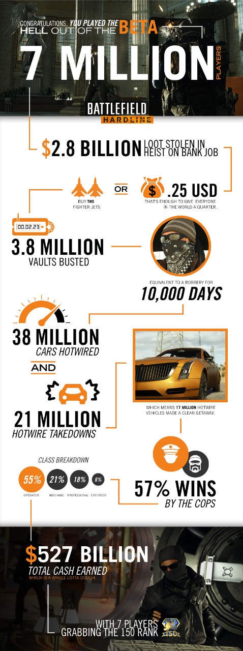 Showing us that over 7 million people participated in the Battlefield Hardline open beta, EA and Visceral Games released an infographic about the beta this week, detailing that seven players managed to achieve the 150 rank and more:
