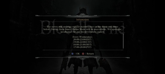 As revealed via an in-game message, the servers for Bloodborne will undergo regular maintenance every Wednesday, making the Online Modes unavailable during that time, though you’ll still be able play the game offline.