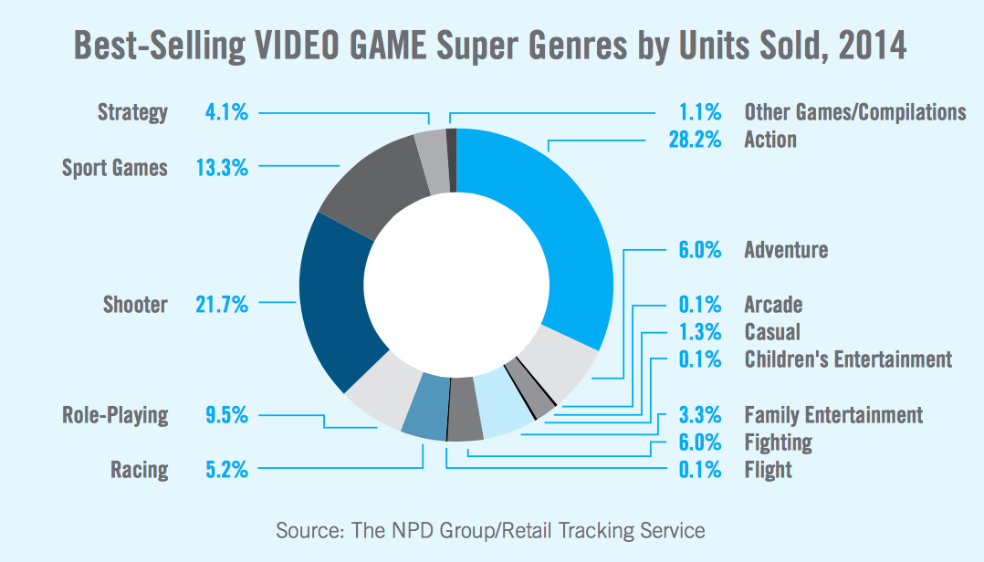 The ESA also compiled some data which shows the popularity of each video game genre in comparison to each other. Not surprisingly, action games are easily the most popular, with shooters trailing behind them. Strategy games and racing games were pitifully some of the least popular game genres of 2014.