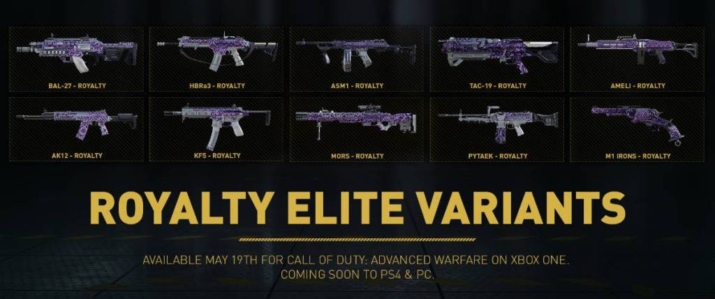 While the M1 Irons is only available on Xbox One and Xbox 360, the five non-akimbo variants of the SAC3 and 10 Royalty Elite variants are “coming soon” to PS4 and PC: