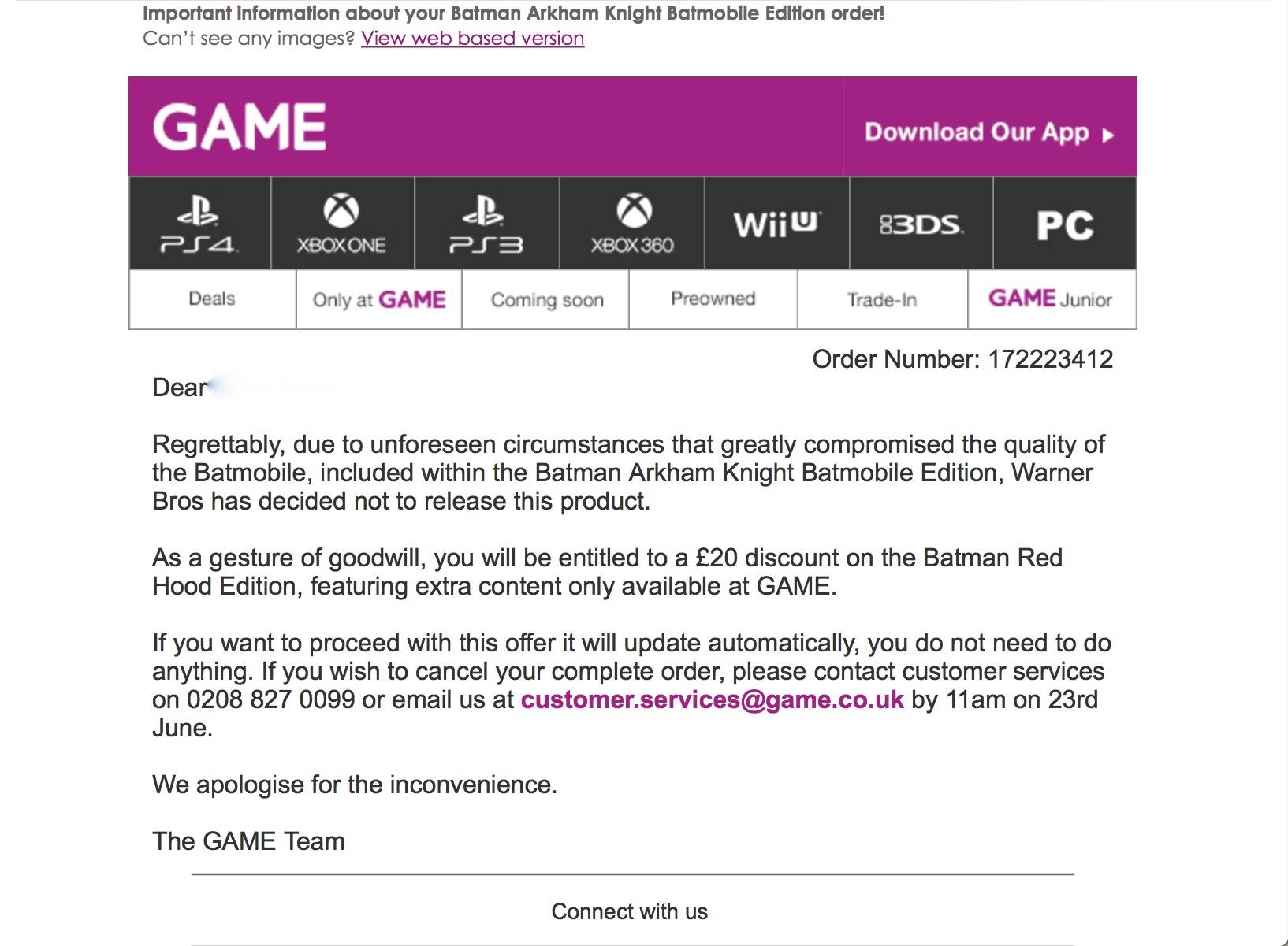 Over on NeoGAF, a screengrab from a GAME email was posted that cited that due to “unforeseen circumstances that greatly compromised the quality” of the Batmobile included in the special edition, Warner Bros. has decided not to release it.