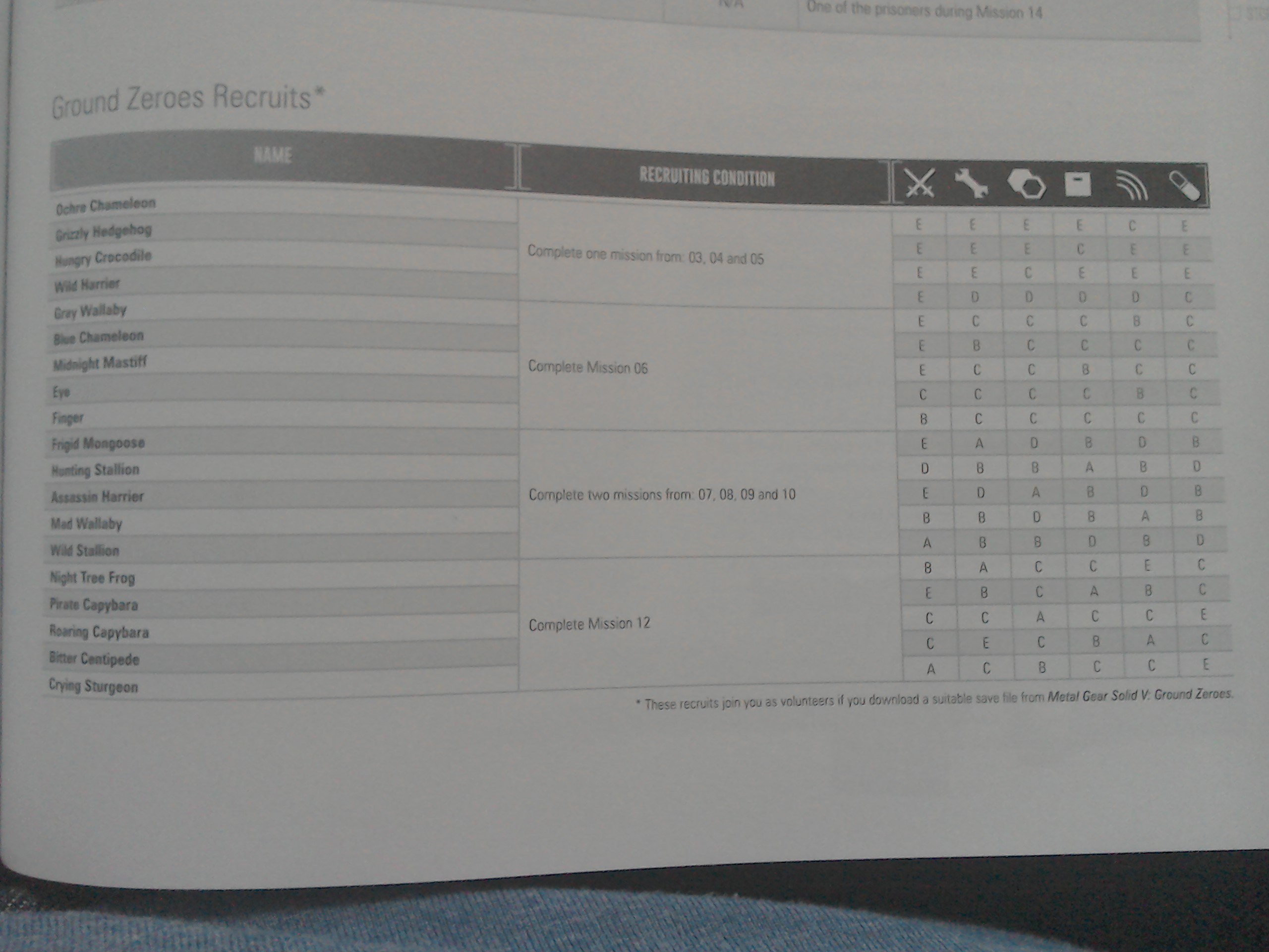 Alongside the Ground Zeroes recruits listed in the image below, players will reportedly be able to unlock in-game costumes such as the Sneaking Suit, Solid Snake, Gray Fox, and Raiden. Make sure to click the photo below to enlarge or open in a new page.