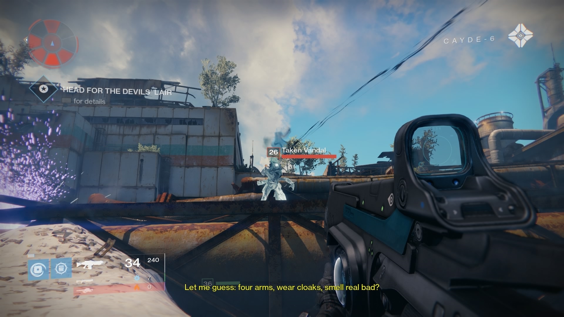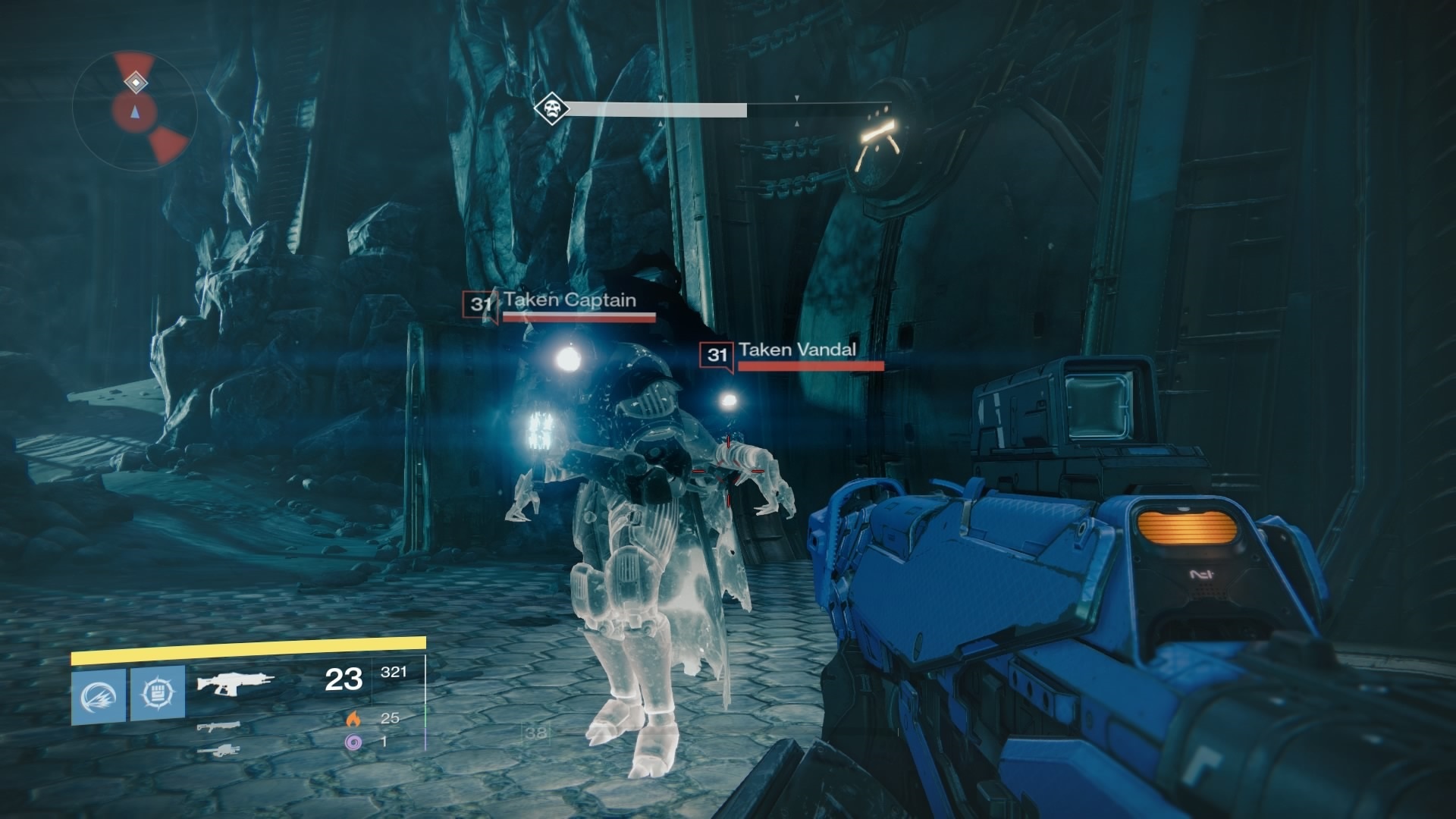 One of the most frustrating Taken enemies to fight, especially in large numbers, the Taken Captains will shoot a large blast of darkness that will blind you if it touches you. Keep your distance so that you can react and avoid the blast. Taken Captains also have solar shields instead of arc.