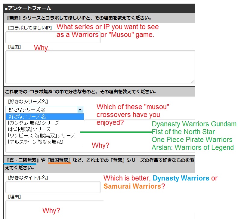 Famitsu is currently conducting a survey to see which musou games (“Warriors” games. Think Dynasty Warriors, Pirate Warriors, Dragon Quest Heroes, Hyrule Warriors and so on) have been the fan favorites and more importantly, what other franchises you’d like to see as musou games. Koei Tecmo does a lot of listening to surveys like this, so if you want to show your fan demand for a particular franchise, this seems like the place to do it. Need help filling out this Japanese survey? Good news! I’m Heath and this is kind of what I do! 😀