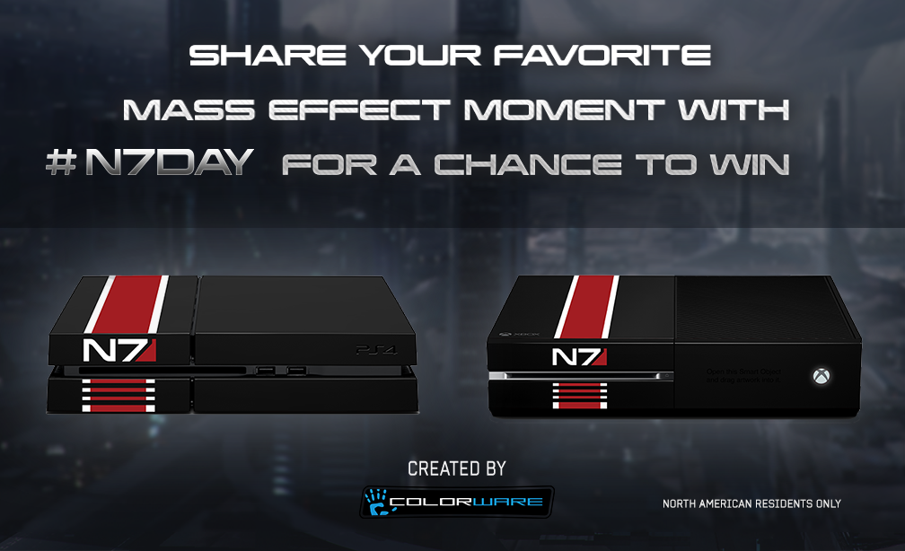 Yesterday was N7 Day, and some lucky folks who shared their favorite Mass Effect moment on Twitter using the hashtag #N7DAY might be in for a surprise. By simply doing so, you’re in for a chance to win either a custom PlayStation 4 or a custom Xbox One console. BioWare didn’t exactly detail the competition (i.e. when it ends, when winners will be announced, etc) except for mentioning that it’s open to North American residents only. Nevertheless, check out the console above (click to enlarge or open in new window).