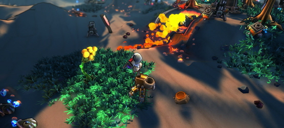 McDroid has two major distinctive features: one is its unique look, which is very colorful and stylized, and the other is mixing tower defense with action gameplay. Starting with the latter, you will be able to build various weapons, like lasers, rocket launchers or tesla cannons, and place them as stationary turrets or carry them on your back and use them as traditional weapons. This lets you have automatic weapons to protect one part of the level, while you take more personal approach to bug eradication elsewhere. You’ll need to plant and harvest resources (And protect them!), you’ll find blueprints and discover new weapons and you’ll also get side-kicks as you play to help you cover more places at once.