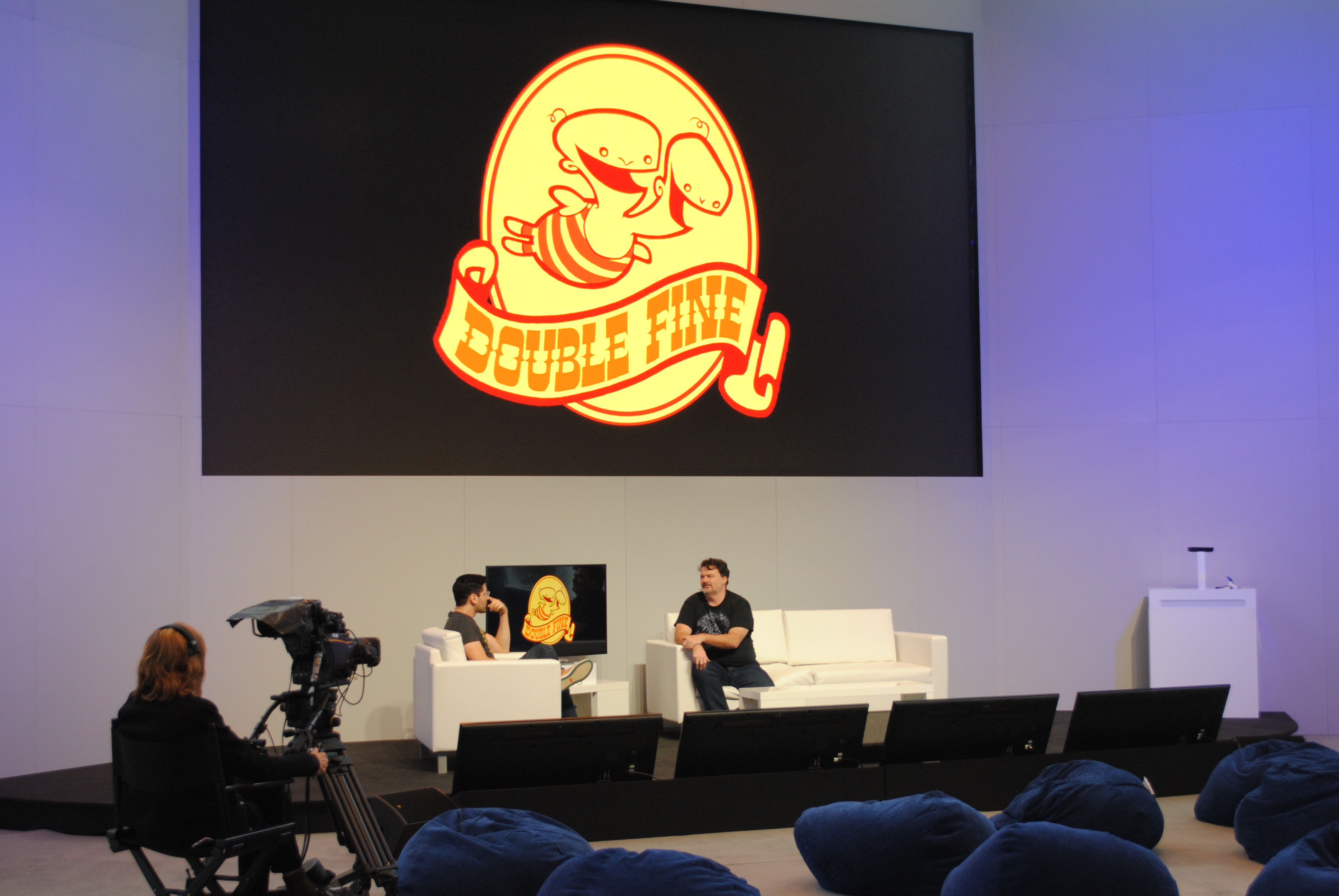 Tim Schafer sits on the livecast stage to talk about the games that Double Fine is bringing to the PS4.