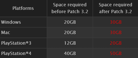 At the moment, A Realm Reborn demands 40GB of space. After patch 3.2, however, it will latch on to 50GB of storage. It doesn’t take a mathematician to work out that the update will be bringing a whopping 10GB of content to the game next month.