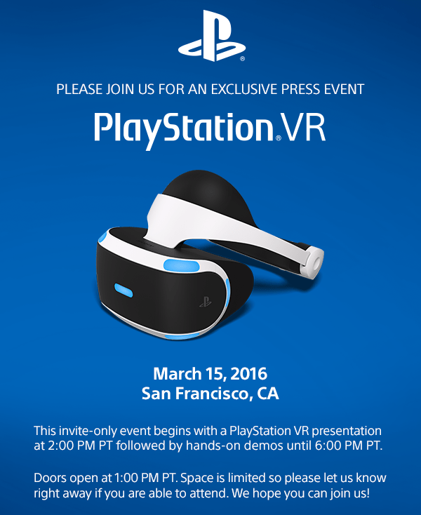 Taking place during GDC 2016, Sony will be hosting an exclusive invite-only PlayStation VR press event in San Francisco on Tuesday, March 15, beginning with a presentation at 2pm PT/5pm ET.